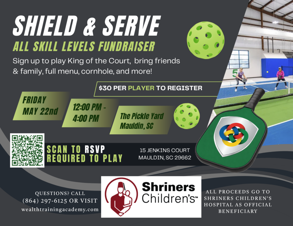 Join us for our Shield & Serve All Skill Levels Fundraiser at The Pickle Yard in Mauldin, SC. This fun and competitive afternoon features King of the Court, welcoming players of all experience levels, whether you’re brand new or a seasoned player. Round 1 will be 12:00–2:00pm and Round 2 will be 2:00–4:00pm.
