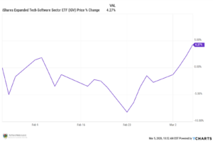 Software was left for dead and has been at least temporarily resurrected. It’s like the Stephen King short story “Autopsy Room Four.” It’s about a stockbroker who collapses on the 18th green of an apparent heart attack, pronounced dead and then hears the medical staff talking about him as they prepare to cut into him to perform an autopsy. It was a Peruvian boomslang snaking through the bushes in the rough that had bitten him as he searched for his wayward golf ball, rendered him paralyzed and seeming dead, just like the IGV, the iShares Software sector ETF looked before the last few days. You can see that on the chart here, and it’s actually – somehow – up on the month as of the writing of this. We’re still skeptical of the software space and will continue to monitor this situation as it develops. For now, software seems to have elevated beyond a “dead cat bounce.” Note the double-move higher off the February 23rd nadir below: